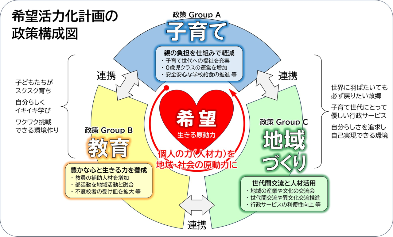 「希望活力化計画」は、「子育て」「教育」「地域づくり」の3つの分野に分けて、一つひとつ丁寧に掘り下げました。